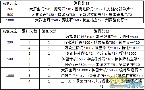 1、活动期间,玩家每日充值相应元宝可获好礼。