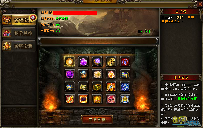 1. 活动期间每充值5000元宝即可活动1次开启宝藏的机会。
