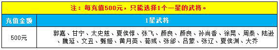 注:(“装备篇”、“材料篇”、“武将篇”、“金币篇”是分开的。例如充500元,只能选择其中一项奖励)