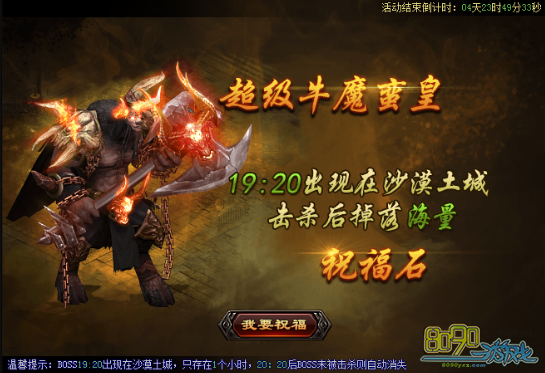 祝福盛宴:活动期间,每天晚上19:20超级牛魔蛮皇将出现在沙漠土城,击杀后将掉落海量祝福石
