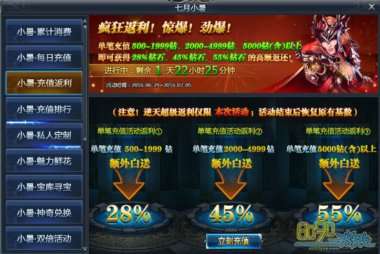 3.单笔充值5000钻(含)以上即可获赠55%钻石高额返利!