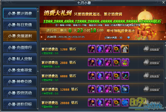 【活动内容】:活动期间,小充一把玩玩,奖励大把爽爆!累计1天、2天、3天、5天,7天,每天仅需充值888钻石以上,即可领取价值28888钻石大礼包!战力飙升6500+!