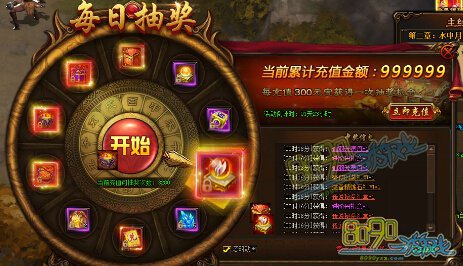 【活动内容】活动期间,玩家每充值300元宝即可获得每日转盘次数一次,转动转盘即可获得各种珍贵道具,赢取酷炫套装、极品传奇装备!