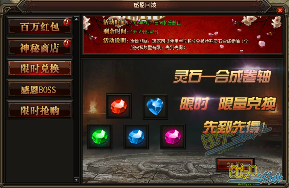 活动详情:活动期间,玩家可以使用寻宝积分兑换特殊灵石合成卷轴(全服兑换数量有限,先到先得)