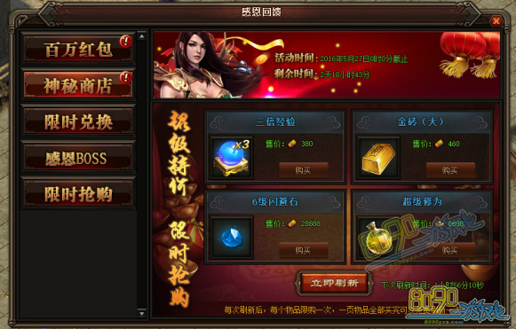 活动详情:家最期待的神秘商店又来了哦,小伙伴们可以已使用金币、礼金、元宝在神秘商店内购买所需道具,只要399元宝就可以进行刷新,每样只能购买一次,如果这一页的购买完了可以免费刷新一次。