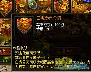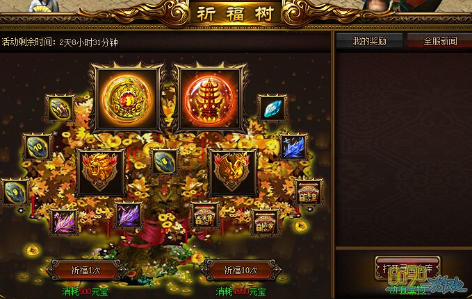 【活动内容】:活动期间,使用500元宝可进行一次祈福或者4950元宝进行10次祈福,大量珍稀道具:金护乾坤镜、三生镇魂塔、白虎器灵令牌、朱雀器灵令牌、11级黑铁、特戒结晶、天尊装备箱等!