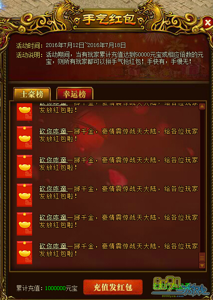 活动期间,当有玩家累计充值达到50000元宝或相应倍数的元宝,则所有玩家都可以拼手气抢红包!手快有,手慢无!