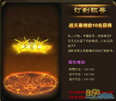 1、活动结束后请豪榜前十的玩家在活动结束后三天内及时向VIP客服提交个性称号的文字内容(称号仅限4个汉字),称号奖励将在活动结束后15天发放!