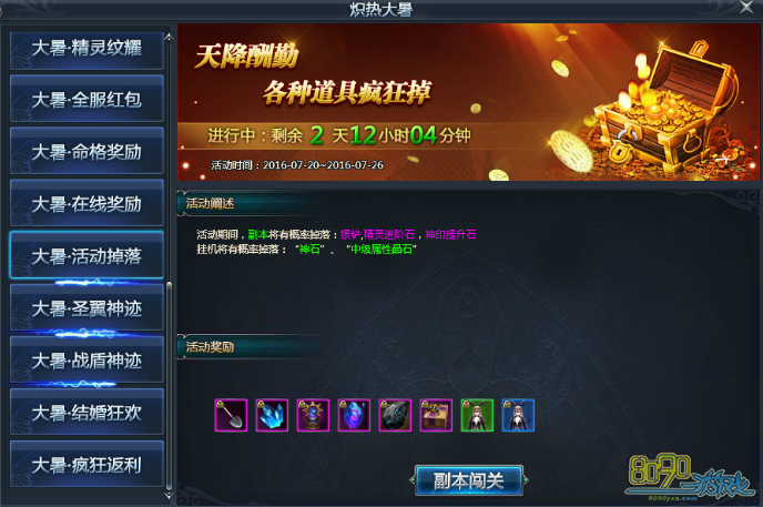【活动内容】:活动期间,副本将有概率掉落:银铲,精灵进阶石,神印提升石