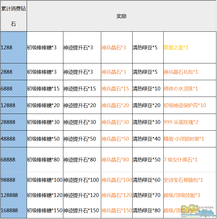 备注:1.单日充值达到888钻石以上即可累积1天,累积达到指引天数即可领取奖励