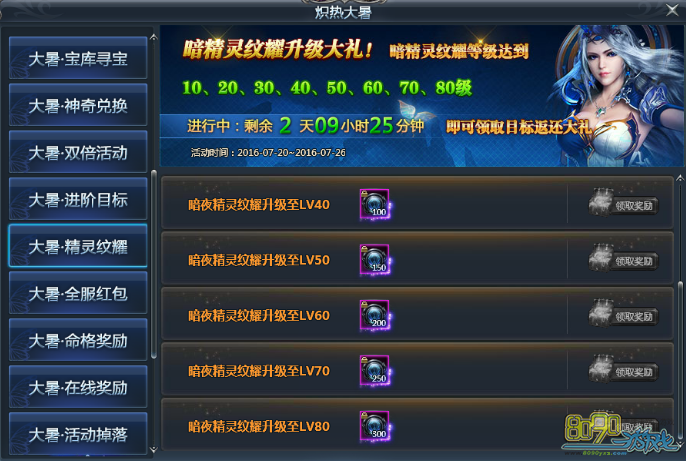 暗夜精灵纹耀升级至LV80,即可领取300个精灵纹耀石;