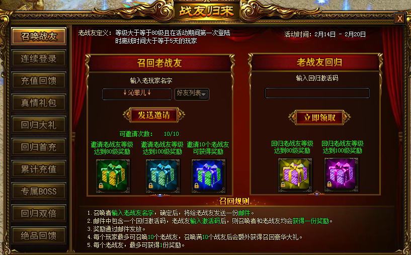 活动内容:召唤者可输入老战友玩家名字,确定后系统将给老战友玩家发送一份召回邮件,邮件中包含一个回归激活码,老战友玩家在本界面输入激活码后召唤者和老战友均可领取丰厚的奖励1份!每个玩家最多可召唤5个老战友
