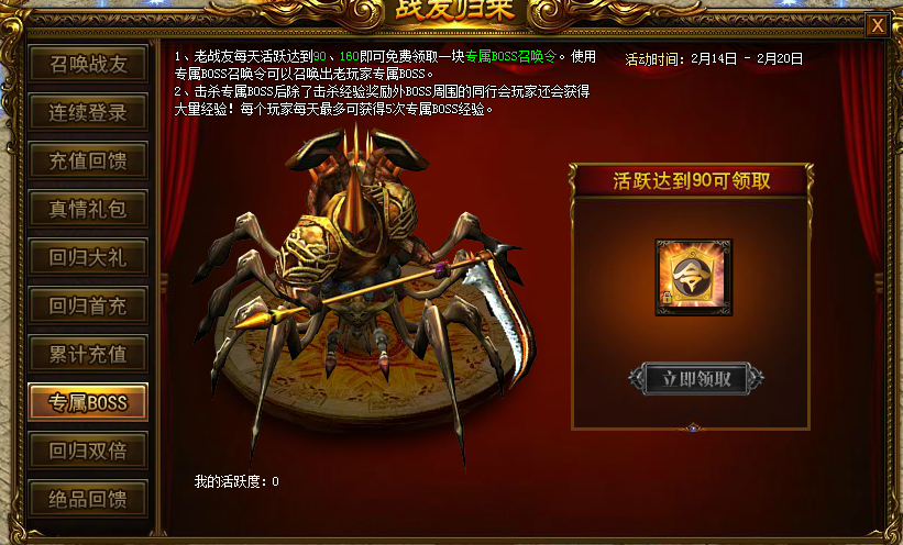 活动内容:老战友玩家每天活跃达到90、160时可分别领取一块专属BOSS召唤令,使用后可召唤出老玩家专属BOSS,击杀后可获得大量的经验奖励,附近的同行会成员也可获得经验奖励!