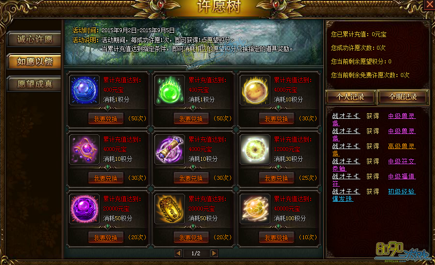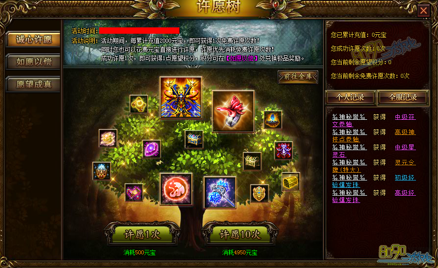 活动期间,每累计充值2000元宝,即可获得1次免费许愿次数!同时您也可以花费元宝直接进行许愿,许愿优先消费免费许愿次数!成功许愿1次,即可获得1点许愿积分,积分可在【如愿以偿】处兑换极品奖励!