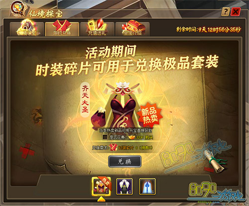 活动期间,时装碎片可用于兑换极品套装。当季热卖的齐天大圣新时装可用时装碎片兑换,也可用元宝直接购买,所需时装碎片不足时,可用元宝补足 。