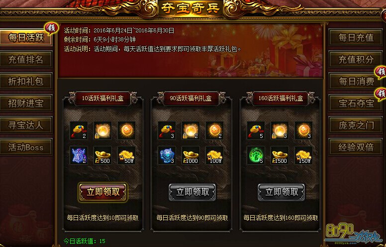 活动内容:活动期间,每天活跃值达到要求即可领取丰厚活跃礼包。