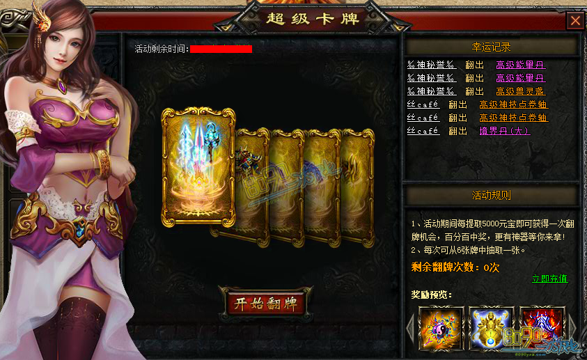 【活动内容】:活动期间,每提取5000元宝,即可获得一次翻牌机会,翻牌百分百中奖,每次翻牌从六张牌中抽取一张,获得珍稀道具。