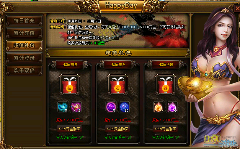 超值礼包,全场2折。每天充值10000,20000,50000元宝,即可获得购买次数,绝对超值。每个礼包每天最多购买3次。购买次数每天24:00重置。
