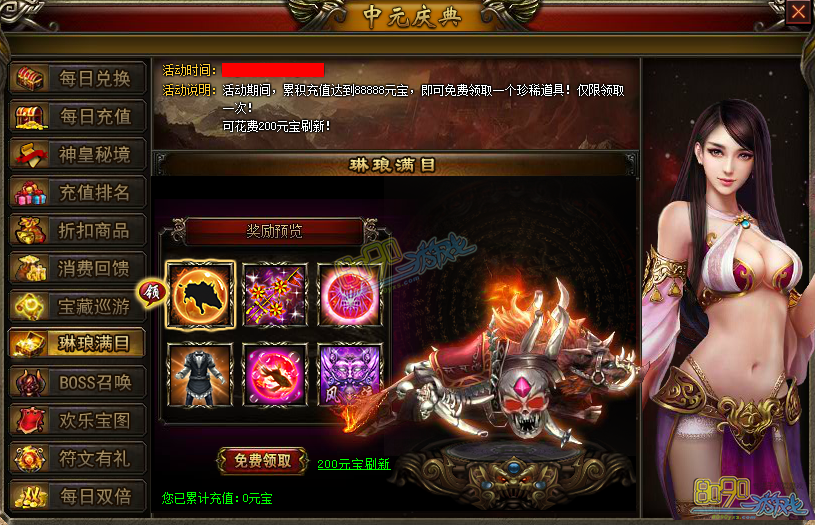 【活动说明】:活动期间,累计充值达到88888元宝,即可免费领取一个珍稀道具!仅限领取一次!可花费200元宝刷新!