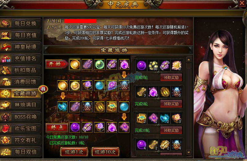 【活动说明】:每次巡游需要500元宝,每天可获得10次免费巡游次数!每次巡游随机前进1-3步,可获得相应的奖励!完成巡游轮数达到一定条件,可获得额外的奖励,完成200轮,更可获得-七杀辉煌战刃!