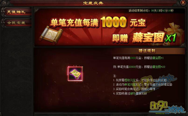 活动期间,单笔充值每满1000元宝,即可获赠藏宝图*1