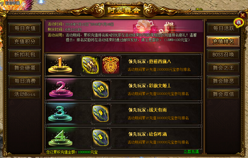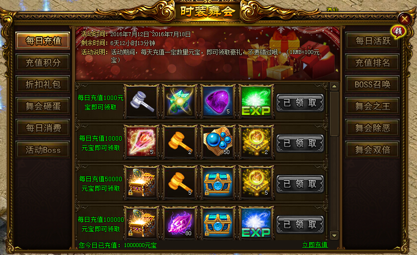 活动期间,每天充值一定数量元宝,即可领取豪礼,不要错过哟!