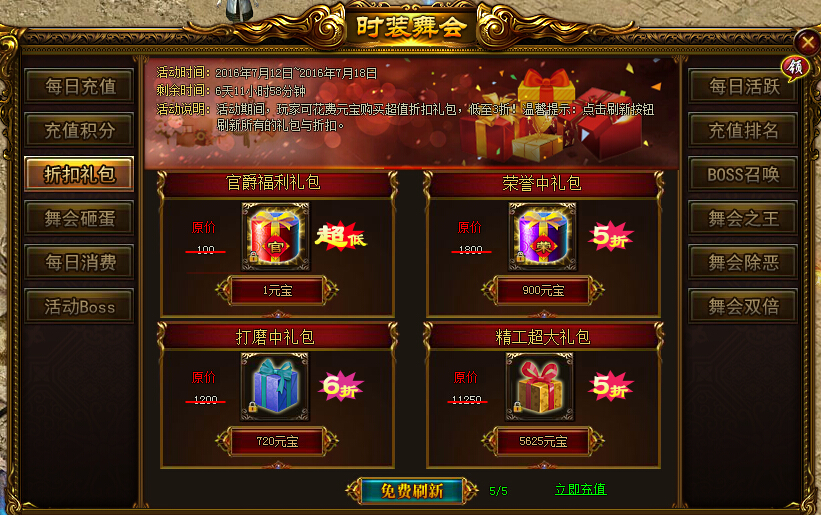 活动期间,玩家可花费元宝购买超值折扣礼包,低至3折!温馨提示:点击刷新按钮,刷新所有礼包与折扣。