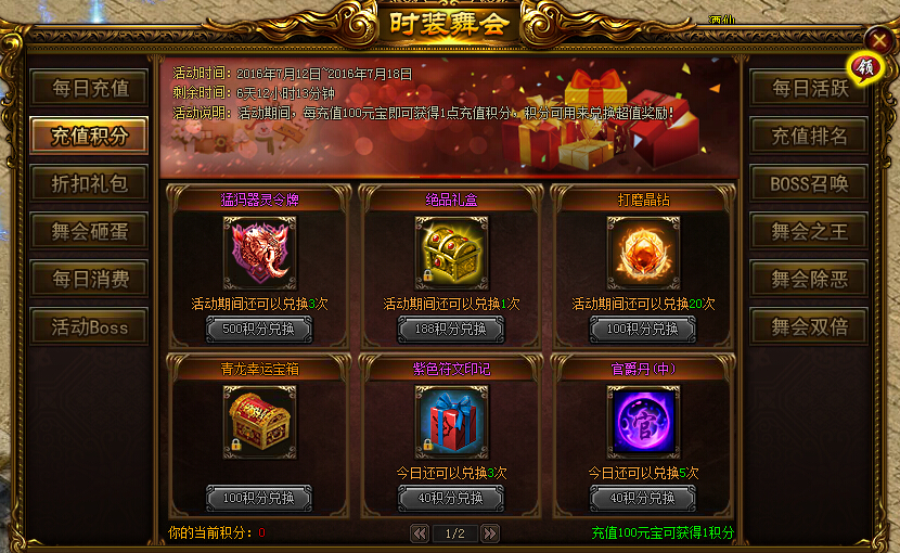 活动期间,每充值100元宝即可获得1点充值积分,积分可用来兑换超值奖励!
