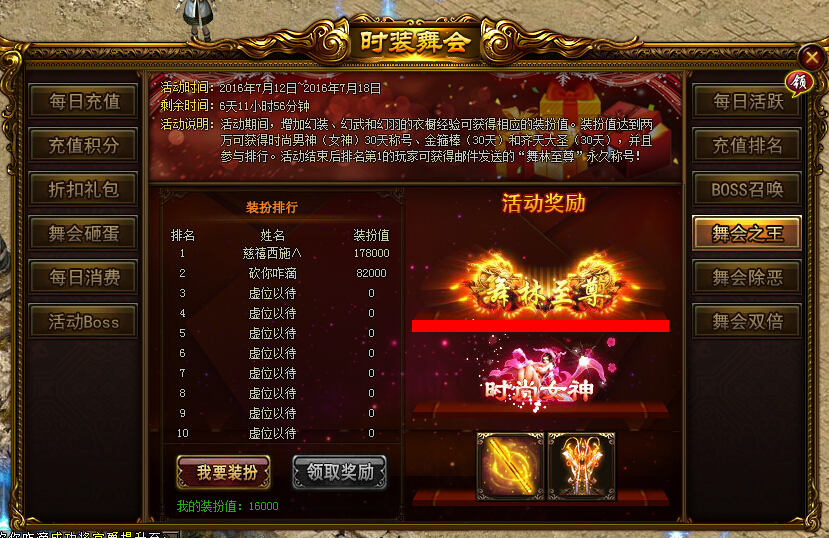 活动期间,增加幻装、幻武和幻羽的衣橱经验可获得相应的装扮值。装扮值达到2万可获得时尚男神(女神)30天称号、金箍棒(30天)和齐天大圣(30天),并且参与排名。活动结束后排名第一的玩家可获得邮件发送的“舞林至尊”永久称号!
