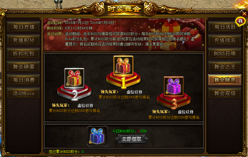 活动期间,击杀boss与精英怪可获得boss积分。每天boss积分达到200即可领取boss积分礼包;累计boss前3的玩家在活动结束时刻获得相应的排名豪礼!
