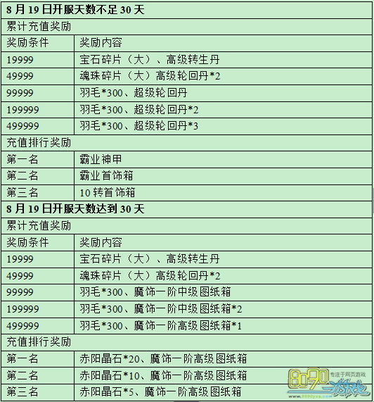 活动期间,累计充值一定元宝即可领取海量奖励。充值元宝数满30w可参与排行,排行前三即可获得对应霸业装备和极品首饰奖励。
