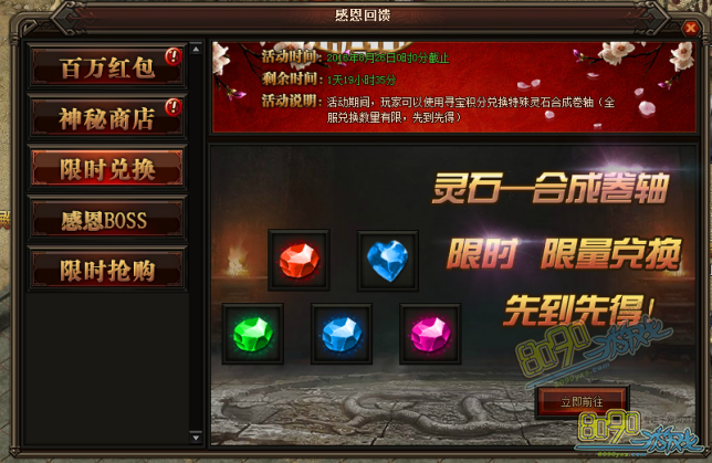 活动详情:活动期间,玩家可以使用寻宝积分兑换特殊灵石合成卷轴(全服兑换数量有限,先到先得)