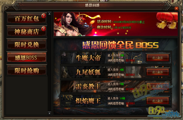 活动详情:活动期间玩家可在挂机地图里打小怪来获得感恩卷轴,例如祖玛寺庙、赤月峡谷、牛魔寺庙、魔龙城、狐月山谷、冰晶神殿、雷炎魔窟、苍月岛等都可以获得感恩卷轴,玩家获得感恩卷轴后可消耗相应卷轴进入副本,副本要求等级为1转、4转、7转、10转、想对应消耗的卷轴为100卷轴、100卷轴、100卷轴、200卷轴。BOSS会随机爆出2、4、6、8转装备不等。