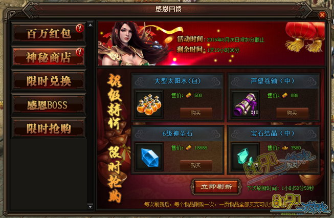 活动详情:家最期待的神秘商店又来了哦,小伙伴们可以已使用金币、礼金、元宝在神秘商店内购买所需道具,只要399元宝就可以进行刷新,每样只能购买一次,如果这一页的购买完了可以免费刷新一次。