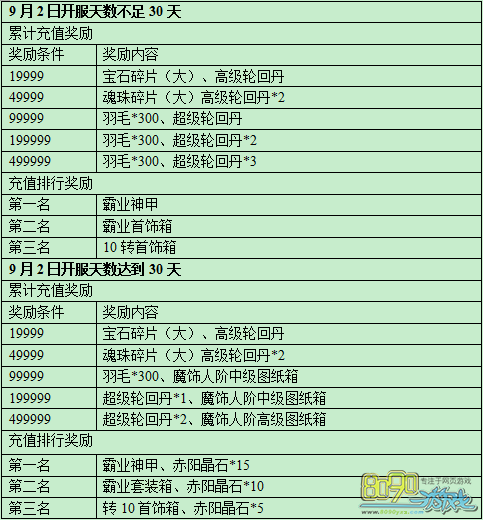 活动期间,累计充值一定元宝即可领取海量奖励。充值元宝数满30w可参与排行,排行前三即可获得对应霸业装备和极品首饰奖励。