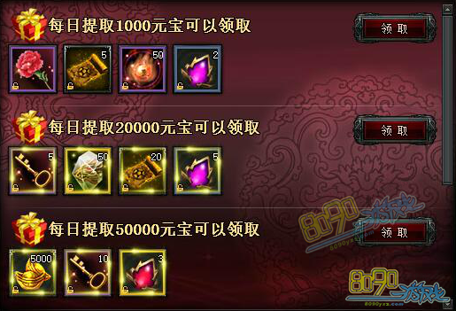 每日提取50000元宝以上可获得:金钥匙*10、5000元宝、经验玉(极品)*3;