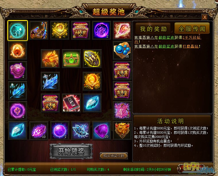 1.每累计充值5000元宝,即可获得1次领奖次数。