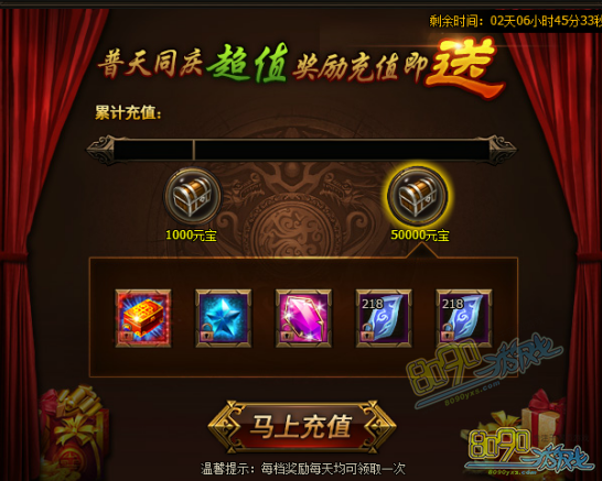 累充50000元宝:特戒礼盒*1,宝石精华(大)*1,魂珠结晶(大)*1,翅膀进阶符*218,坐骑进阶符*218