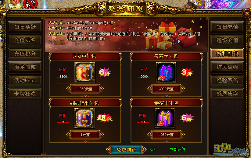 活动内容:活动期间,玩家可花费元宝购买超值折扣礼包,低至3折!温馨提示:典籍刷新按钮刷新所有礼包与折扣。