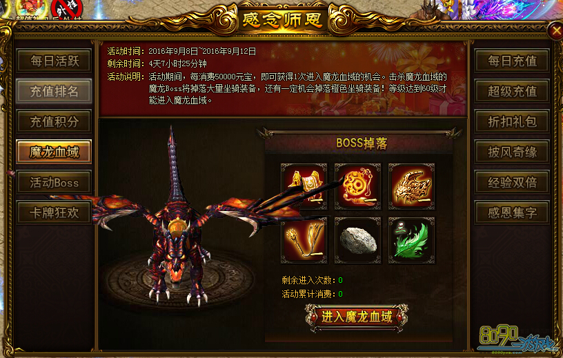 活动内容:活动期间,每消费50000庖,即可获得1次进入魔龙血域的机会。击杀魔龙血域的魔龙Boss将掉落大量坐骑装备,还有一定机会掉落橙色坐骑装备!等级达到60级才能进入魔龙血域。