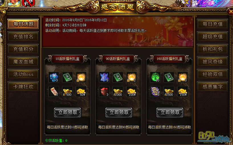 活动内容:活动期间,每天活跃值达到要求即可领取丰厚活跃礼包。