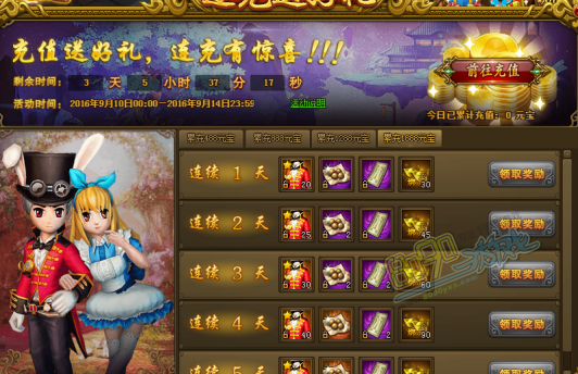 活动规则:活动时间内,累计充值达到指定金额,每天登录游戏即可获得奖励,若某充值档次未达到要求并在接下来的一天未继续充值,则该充值奖励从第一档第一天重新开始计算,每日零点奖励若未领取则视为放弃领奖,但不影响连续充值进度。