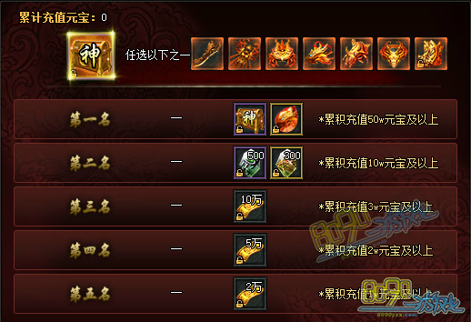 【活动内容】活动期间累计元宝充值排行前5名的玩家可获得丰厚道具奖励!
