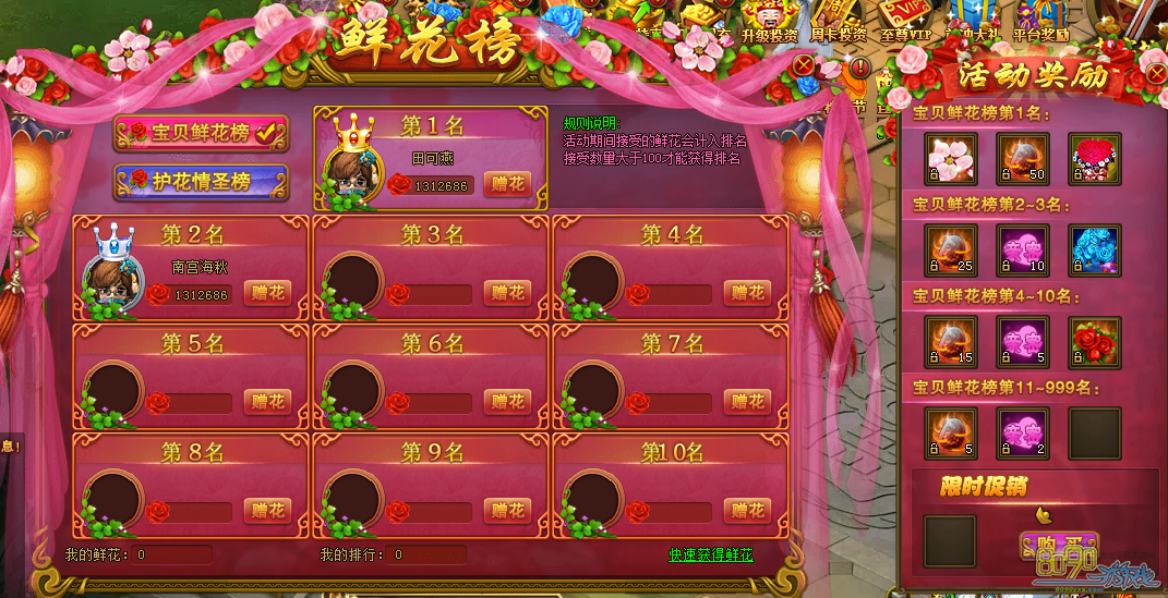 活动规则:活动期间内,收到鲜花数量达到100朵即可获得宝贝鲜花榜上榜资格,赠送出鲜花数量达到100朵即可获得护花情圣榜上榜资格,活动结束时邮件发送对应榜单排名奖励。