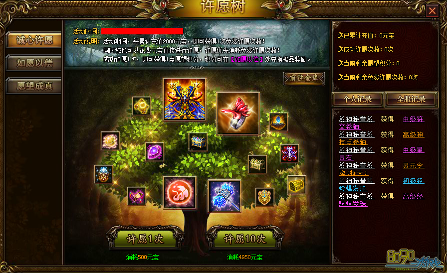 活动期间,每累计充值2000元宝,即可获得1次免费许愿次数!同时您也可以花费元宝直接进行许愿,许愿优先消费免费许愿次数!成功许愿1次,即可获得1点许愿积分,积分可在【如愿以偿】处兑换极品奖励!
