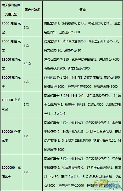 活动内容:活动期间内,每天累计消费一定额度充值元宝即可领取奖励。