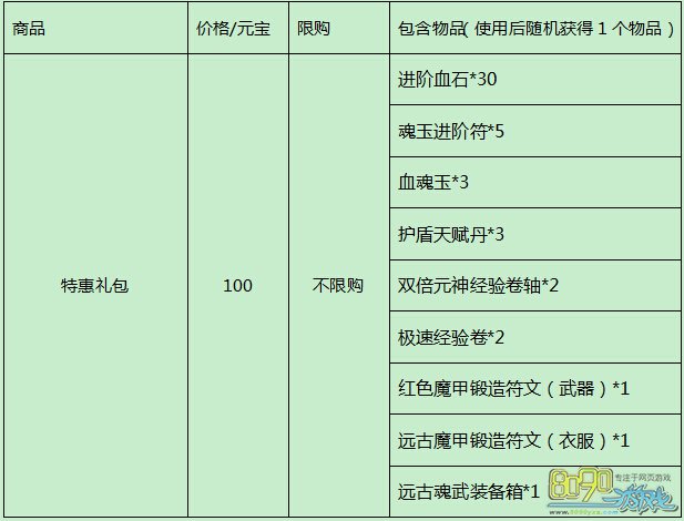 活动内容:活动期间内,可使用元宝购买特惠礼包。