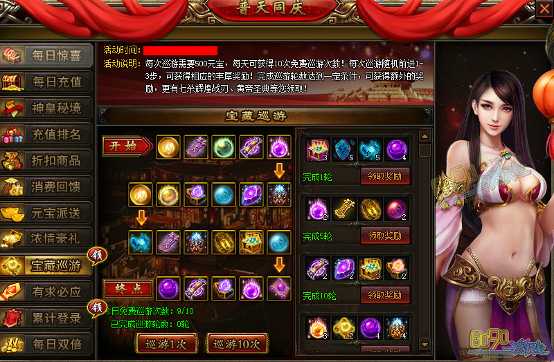 【活动说明】:每次巡游需要500元宝,每天可获得10次免费巡游次数!每次巡游随机前进1-3步,可获得相应的奖励!完成巡游轮数达到一定条件,可获得额外的奖励,更有七杀辉煌战刃、黄帝圣典等你领取!
