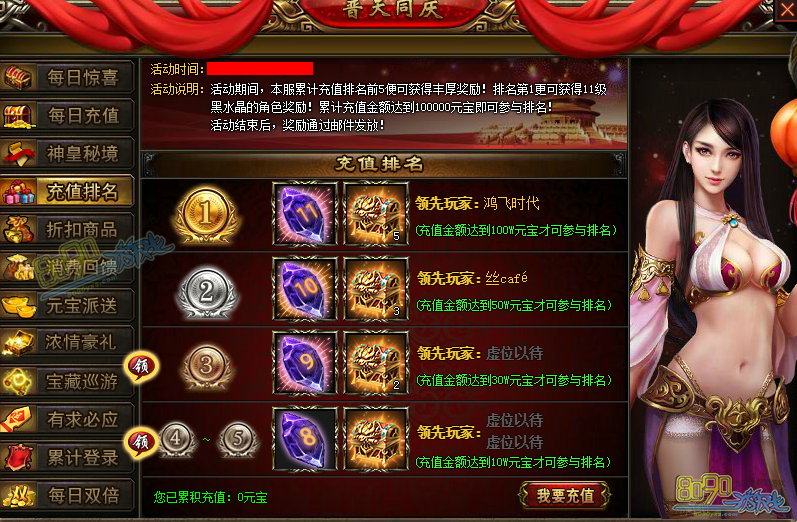 【活动说明】:活动期间,本服累计充值排名前5名便可获得丰厚奖励!排名第1更可获得11级黑水晶的奖励!累积充值100000元宝即可参与排名!活动结束后,奖励通过邮件发放!