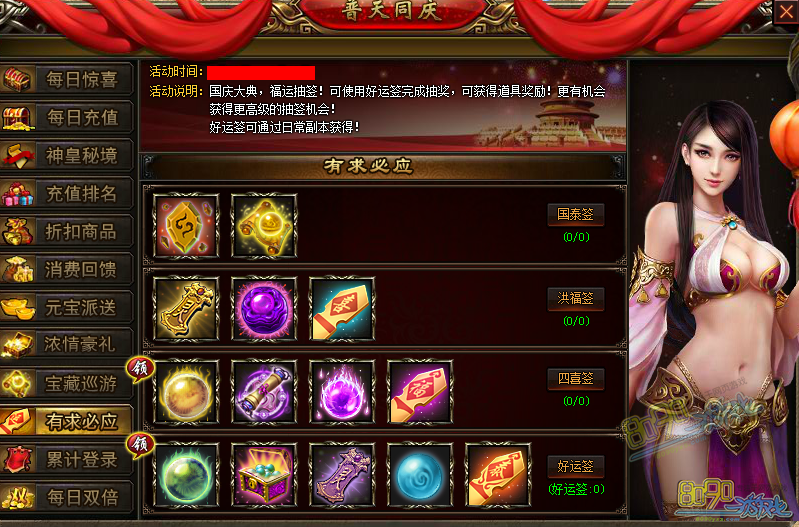 【活动说明】:国庆大典,福运抽签!可使用好运签完成抽奖,可获得道具奖励!更有机会获得更高级的抽签机会!好运签可通过日常副本获得!